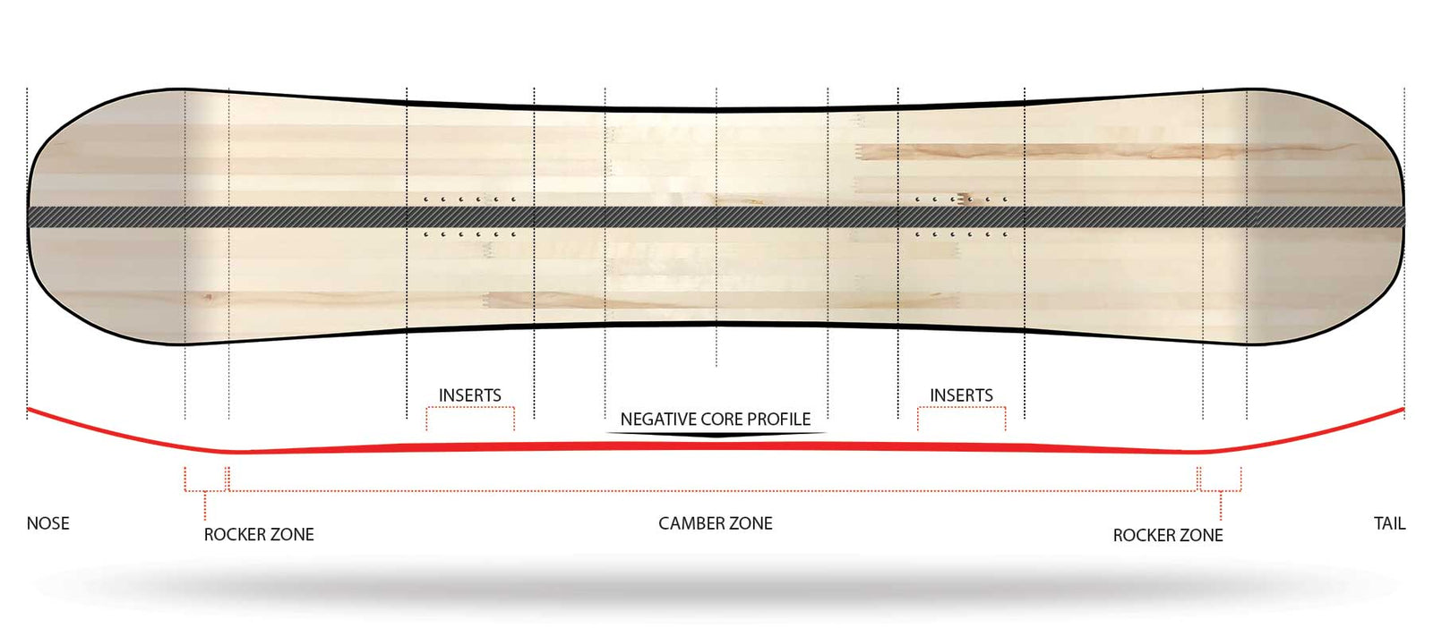 The Halloween Series comes with a negative core profile. We remove some of the wood core between the bindings to help balance the flex from tip to tail. The board feels more playful and adds foot control on all terrain.